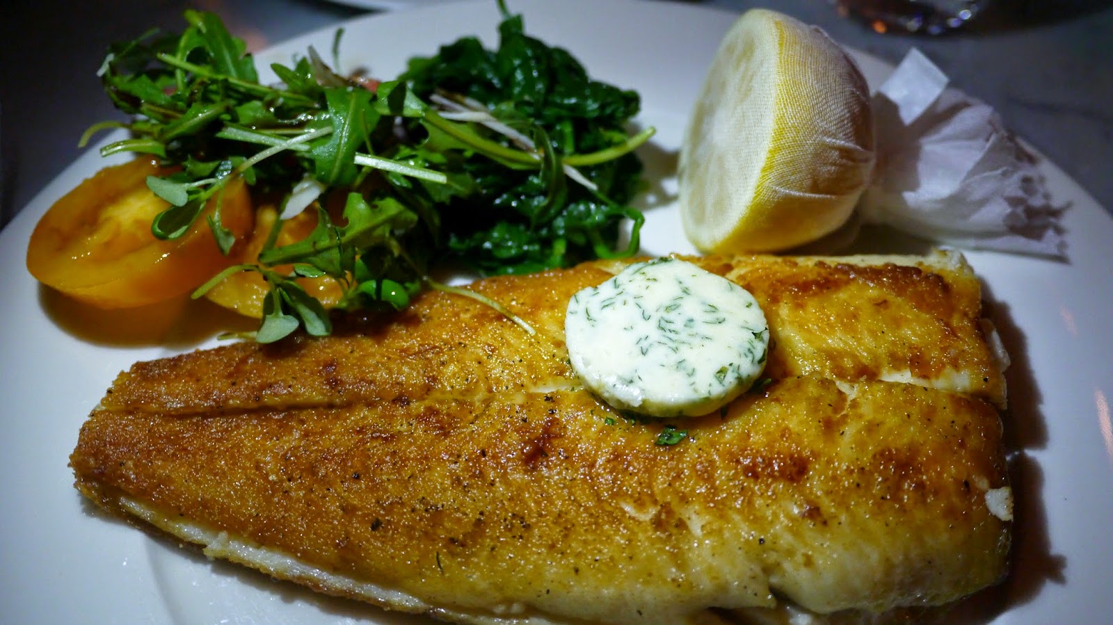 For mains I continued the healthy eating with Whole lemon sole, with spinach, and tomato and rocket salads on the side. Katie had the Slow cooked breast of lamb. Both mains were really good and we polished them off very quickly, however the spinach was cold.