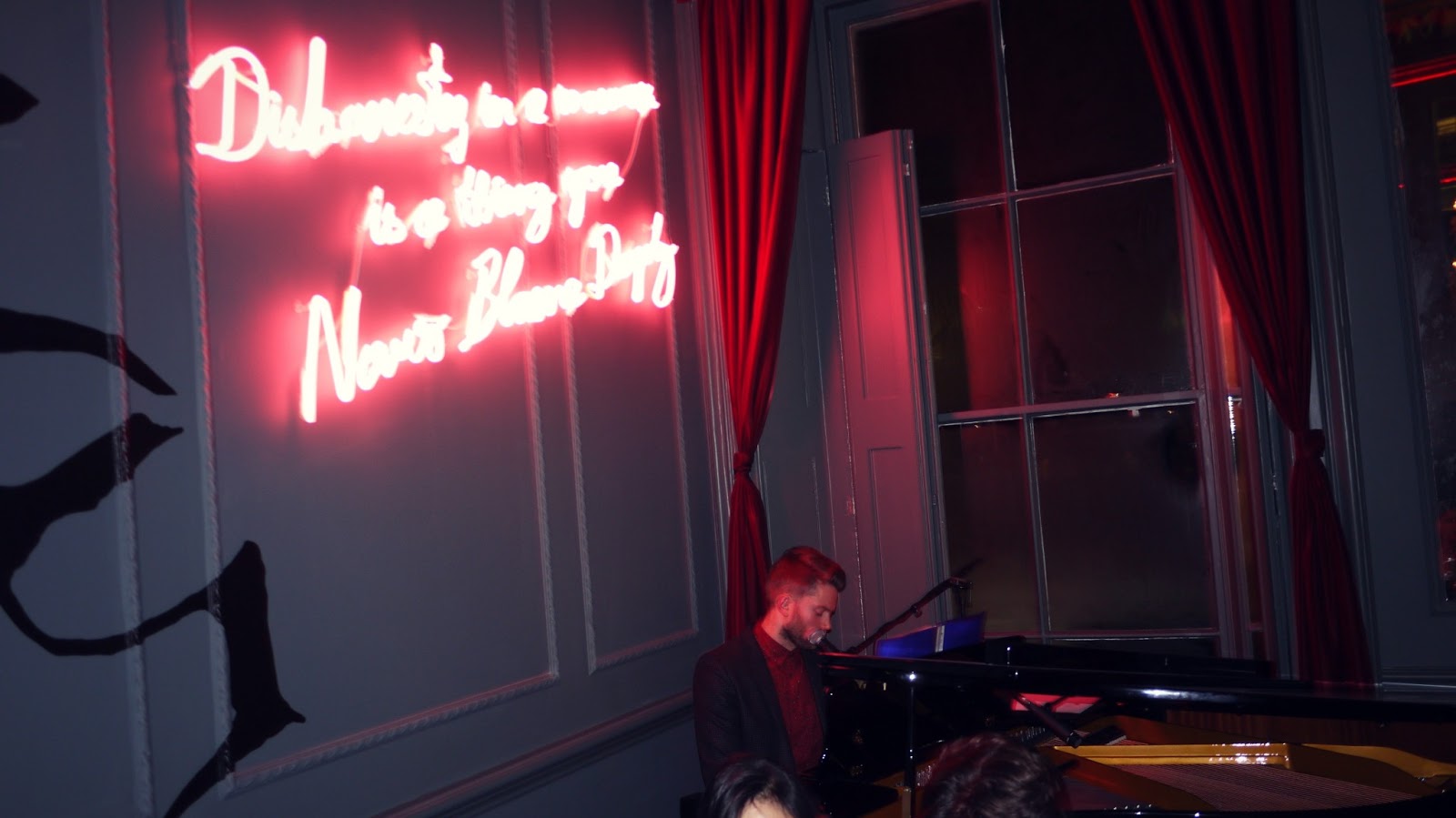 There are three levels to 3 Cromwell, there's the club in the basement, the bar and outside area on the ground floor, and the bistro and bar on the first floor. The band were on the ground floor and then there was a jazz pianist and singer on the first floor. He was also really good, and I loved the atmosphere upstairs, it was really relaxed and chilled out. There are Great Gatsby quotes on the walls in neon, which is perfect with the film coming out soon!