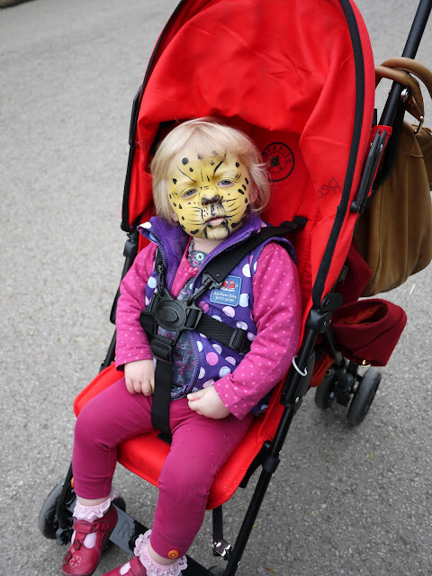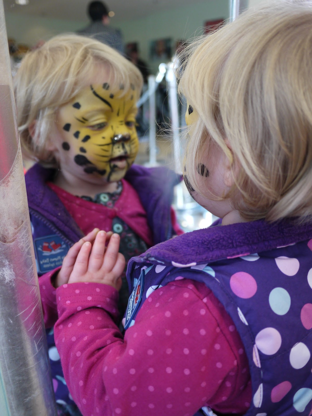 Rosie got her very first face-paint...and discovered in the mirror that she had become a baby cheetah!