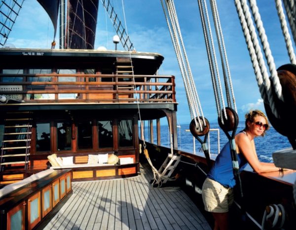 Manned by crews of 50 or more men, their sailing praus would swoop down on traders, secure in the knowledge that if resistance was too fierce they could simply paddle to safety into the eye of the wind. These days, voyages in this area are far more peaceful and we enjoyed a sun-blessed morning lounging on Dunia Baru’s overhanging aft deck, watching a pod of almost 100 dolphins chasing a school of leaping tuna while frigate birds soared overhead.
