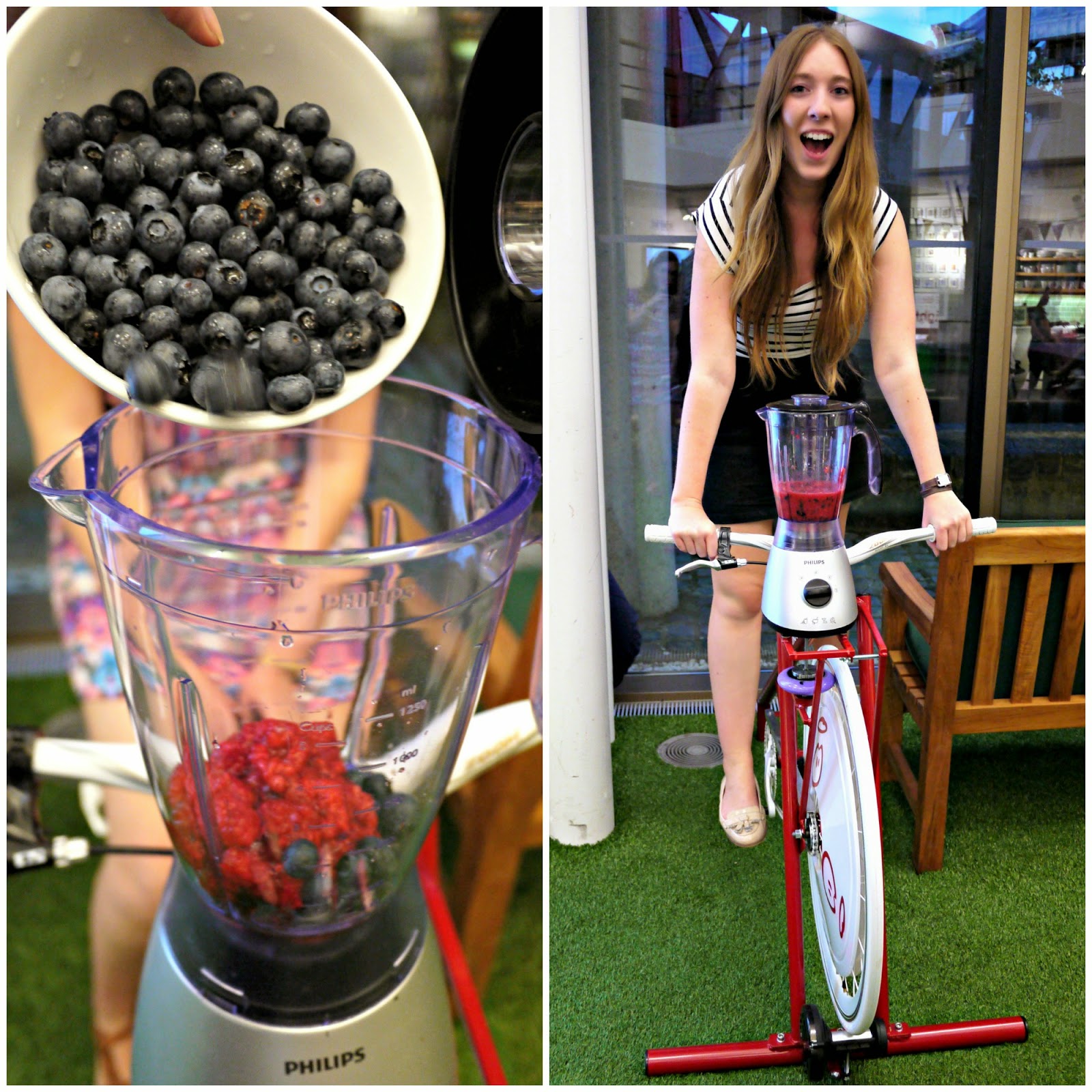 We made a delicious smoothie full of healthy blueberries, raspberries, apple, and apple juice. Sadly though, it was quite hard work on the bike, especially as both of us were wearing skirts, so our 'juice' turned into a very thick smoothie that resembled more of a compote...it was still yummy though!