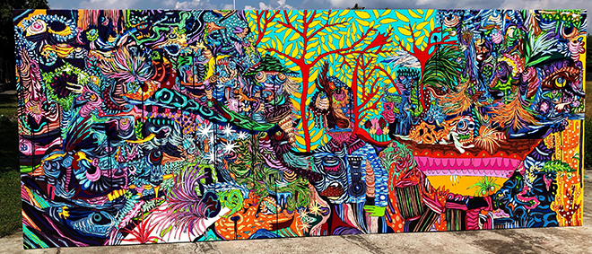 Mostly i’m using opaque techniques in my work. Where the vivid and intense colors were mixed up a lot, then lines were made to emphasize the object or deformation that i created on the canvas.