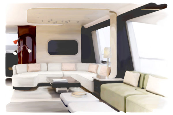 who likes to stand out from the crowd, says a spokesman. Interior design by Achille Salvagni presents “an unprecedented mix of the elegant and the casual”, while her sleek exterior lines are by Stefano Righini. The vessel has a Carbon Tech superstructure, roll-bar and hard top. Although one of the smaller Azimut Grandes, she has a tender garage and separate crew quarters, and Salvagni has introduced lacquered surfaces in colours ranging from purple to sugar paper. Layout is fairly open plan in the living areas, and there are four guest cabins on the lower deck, three with double beds. Power comes from twin 1650 HP MANs, or 1800 HPs which allow a top speed of 29 knots.