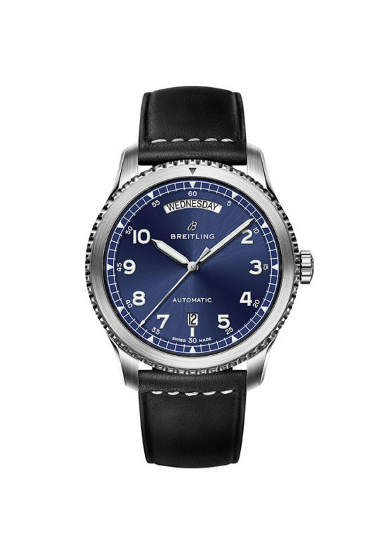 The Navitimer 8 B01 flies at the top of this squadron. The 43 mm watch is offered with black or blue dial in the stainless steel case or the bronze dial in the red gold case. For all Navitimer 8 B01 models, the subdials are executed in a contrasting tone with the dial to denote the use of an in-house movement which in this case is the B01 with 70-hour power reserve. Elsewhere beneath the convex sapphire crystal with double anti-reflective coating, the inspiration from the aforementioned 1940s cockpit clocks shines: the most notable of which are the typeface of the Arabic numerals and the railway minute track with small triangular markers for every five minutes. The notched bezel turns bidirectionally and features an arrow mark as well for practical purposes.