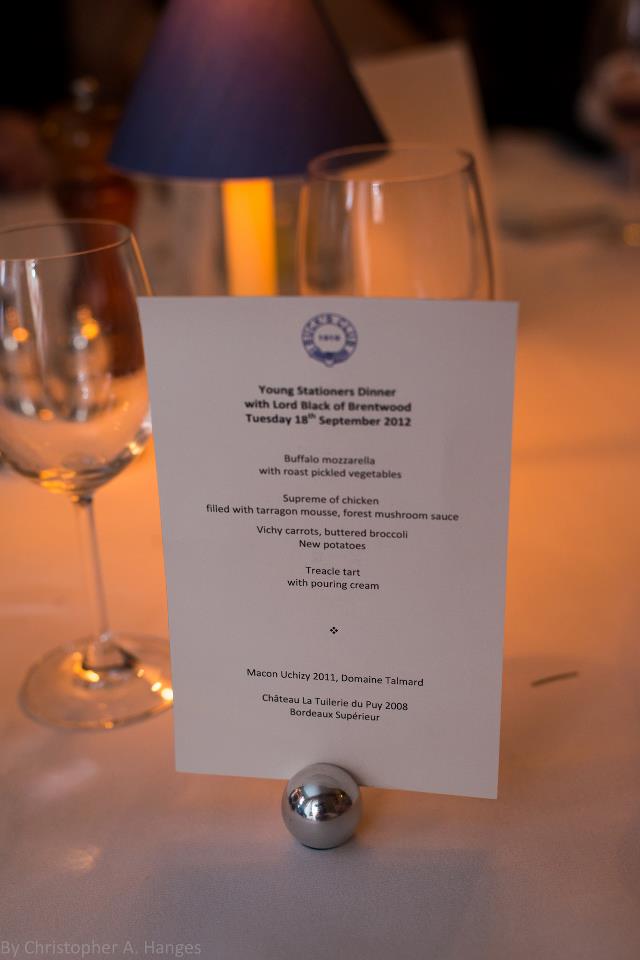 Last week was the Young Stationers black tie dinner at Bucks Club, the club where Bucks Fizz was created! We had a champagne reception before a sumptuous three-course dinner in the beautifully intimate dining room. Lord Black of Brentwood attended and gave a talk on the Leveson enquiry and what it means for the media. For those of you who don't know, Guy Black (aka Lord Black) is the CEO of the Telegraph media group, so the talk he gave was really interesting and he's a fantastic speaker - very engaging and easy to listen to.