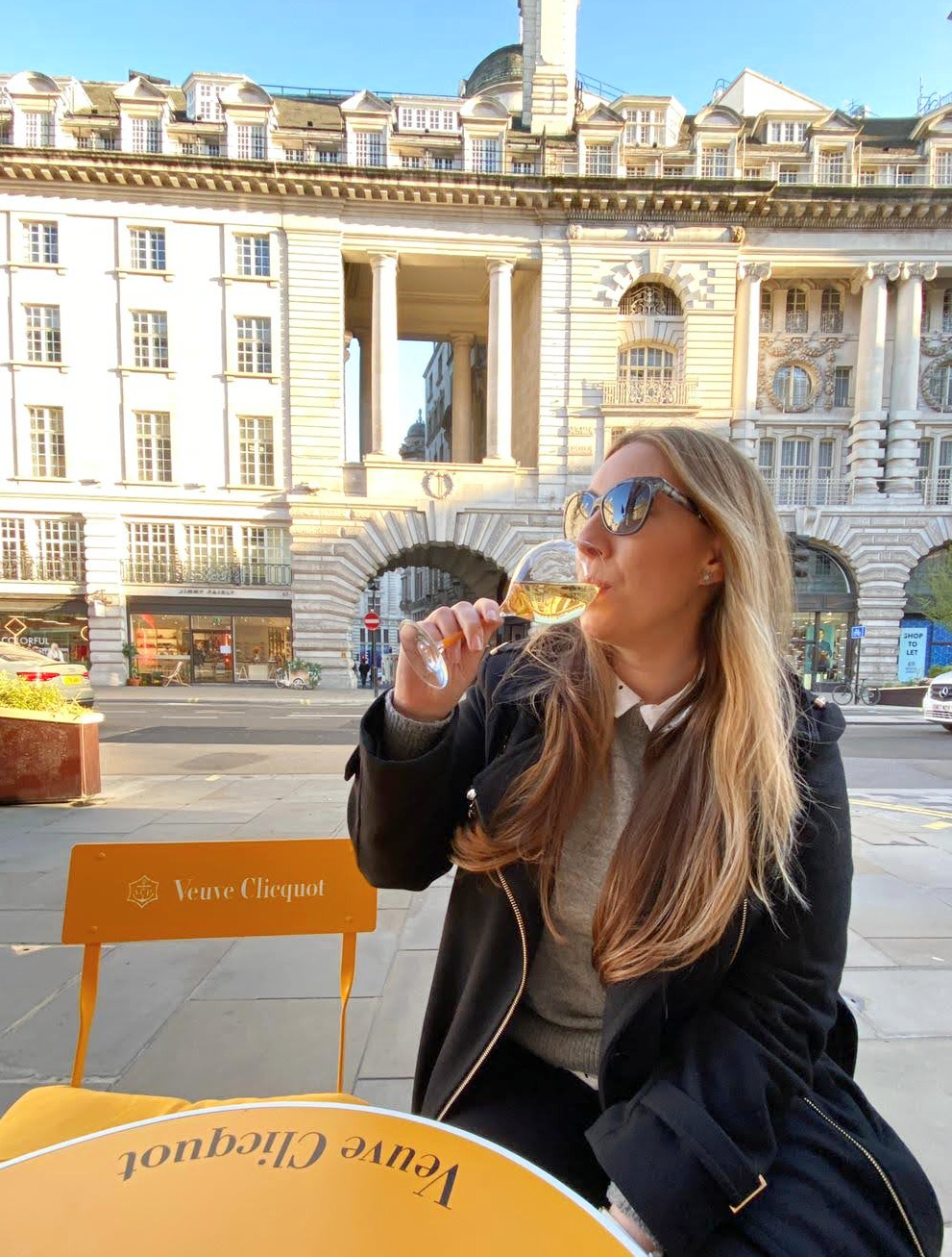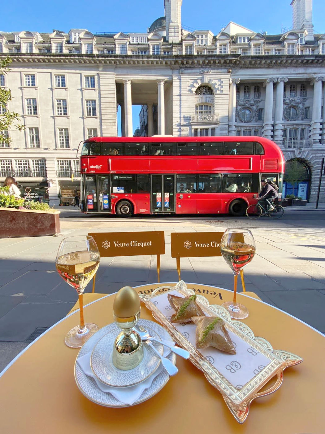 I got there a little early so ordered a glass of Veuve Clicquot champagne and settled into our Veuve Clicquot-coloured seating on the side of Regent Street. It was pure magic just sitting there watching the hustle and bustle of London come to life once more. After months of eerie quiet on the streets, I relished the atmosphere as I sipped on my champagne. As soon as Aftab arrived he joined me with the champagne, and we chose our cakes for our little reverse birthday dinner.