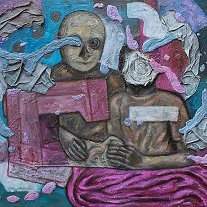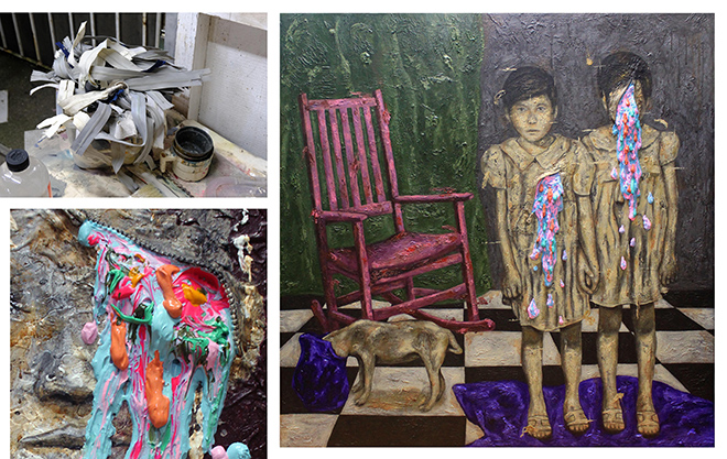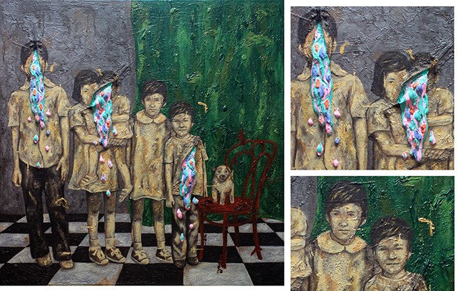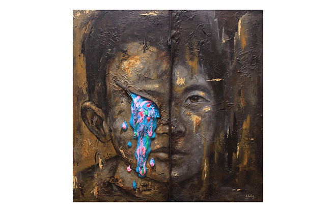 My works are my reflections on current events both personal and social. The form develops in conjunction to how I feel. This is why I am always searching for new techniques or materials as every event is unique in itself. It’s not that I deliberately change all the time, I think it’s more of a gradual process of experimentation. My art style is figurative, interrupted by expressionist strokes, paint blobs or found objects (usually zipper or fabric)