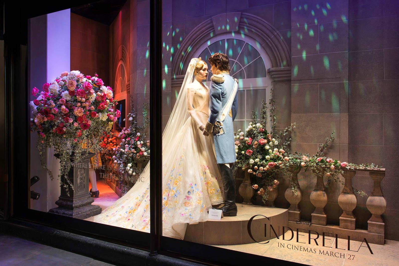 Six scenes from the film have been recreated in the Harrods windows, bringing to life Cinderella’s magical journey of courage and kindness. Scenes depicted in the windows include Cinderella meeting her Fairy Godmother, and the wicked step-sisters' unsuccessful attempt to make the glass slipper fit. All of the windows feature the original costumes designed by Sandy Powell for the film and as worn by the all-star cast including Lily James (Cinderella), Cate Blanchett (Lady Tremaine) and Helena Bonham Carter (Fairy Godmother).