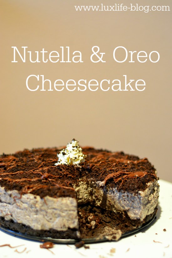 My creative flair consisted of blending the Oreos into crumbs, and the mixing them so well that it gave the Cheesecake a proper 'grey/chocolate/oreo' colour, rather than just a cream colour with Oreo chunks. Don't get me wrong, I love chunks of Oreos, but they don't make the entire cheesecake taste of Oreo. If you get what I mean? Also the drizzled melted Nutella on top just adds the perfect hint of hazelnut and chocolate.