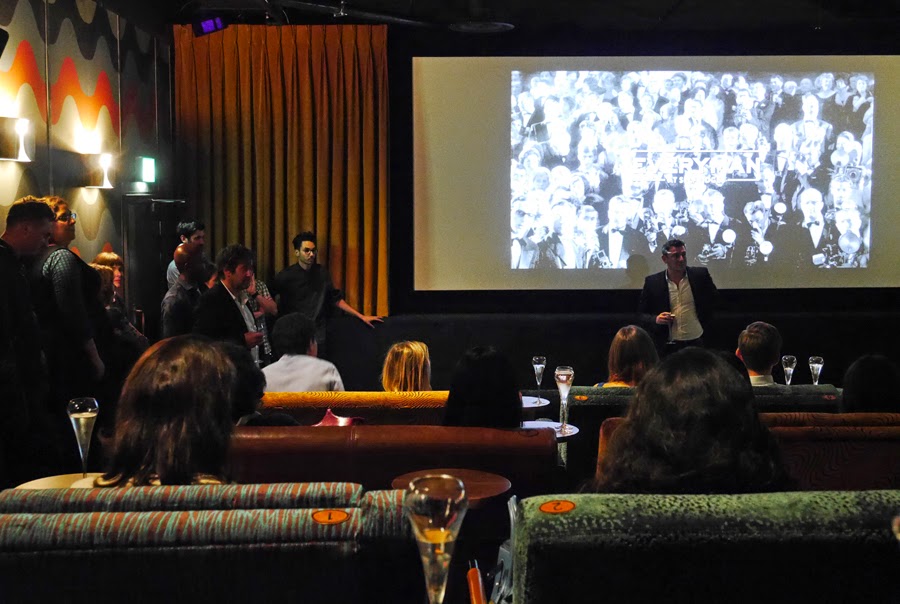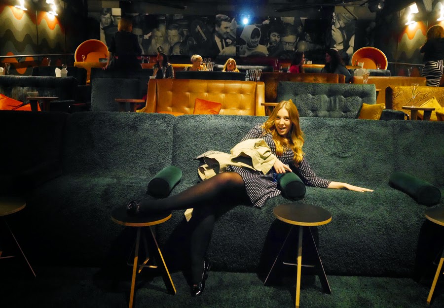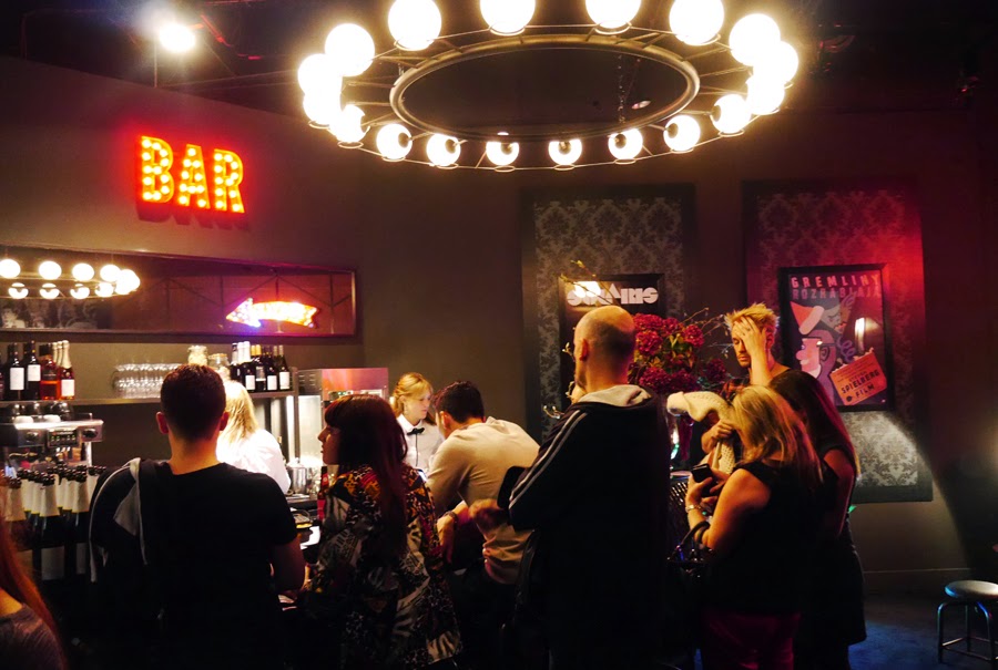 Sadly I left my camera battery at home in the charger (doh!), so all photos are courtesy of Jasiminne who came to the rescue with her camera. The cinema was wonderfully fun, with neon lights and glamorous black and white images of famous Hollywood movie stars covering the walls. The plush seating was the perfect place to relax with a glass of champagne before the movie, and the bar was definitely the focal point of the 'waiting lounge'.