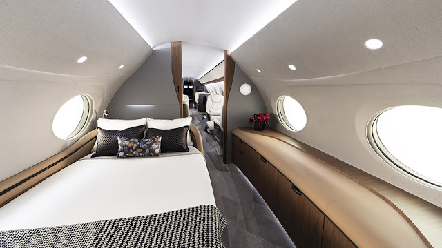 Other details that enhance the flying experience include speakerless surround sound designed in collaboration with Bongiovi and ultra-high-definition circadian lighting (goodbye, jet lag!) that can actually emulate sunrise and sunset. The cherry on top, of course, is the master suite with an en-suite lavatory that includes a private shower, vanity and spacious storage closet for long-haul flights.