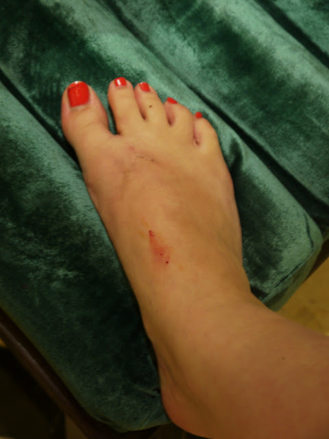 I have no idea how it got onto the top of my foot, but I looked down, to see glass all over the floor near the dressing table, little pieces, and a huge chunk with foundation on it. As well as the glass, foundation was covering the floor, so the people in there before us had clearly smashed a foundation bottle, and the cleaners hadn't cleaned it. We had already spent two hours trying to get an acceptable suite, we were tired, and if we hung around any longer we were going to miss the show that night, so my brother and I took photos, then tidied it up, cleaned my blooded foot, and didn't tell our parents. If we had told them they would have made a fuss, and we would have missed the show and been even more stressed out and unhappy.