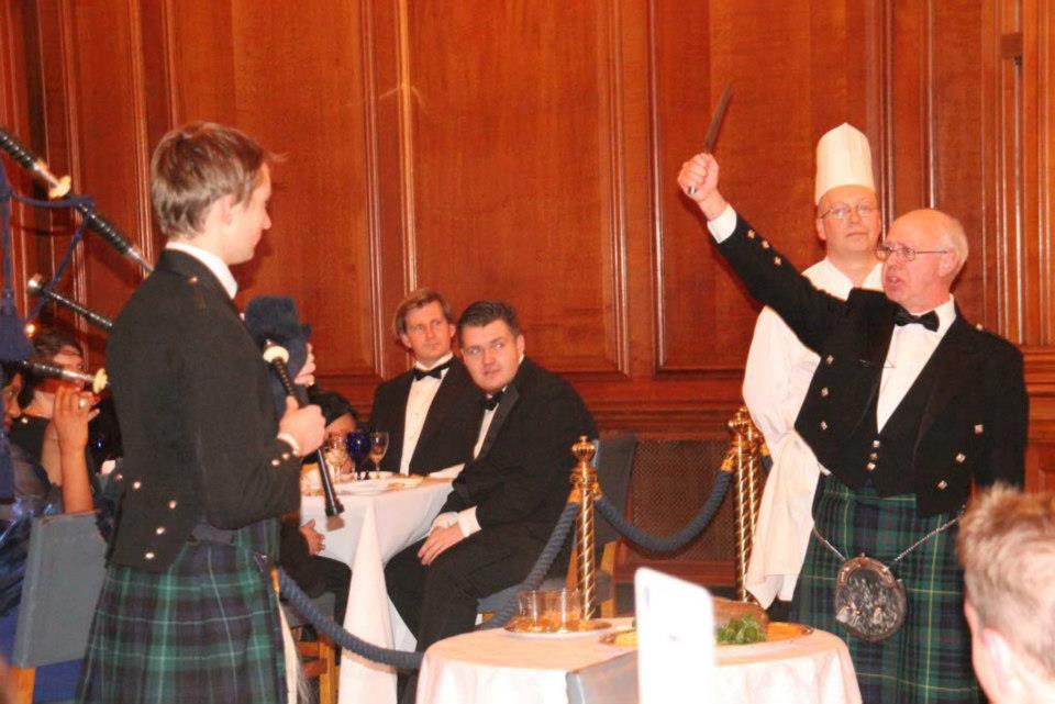 The evening started with a drinks reception, and then we went into the main hall for the piping in of the Haggis, and the 'addressing of the Haggis', before we sat down for a dinner of scrumptious Scottish delicacies.