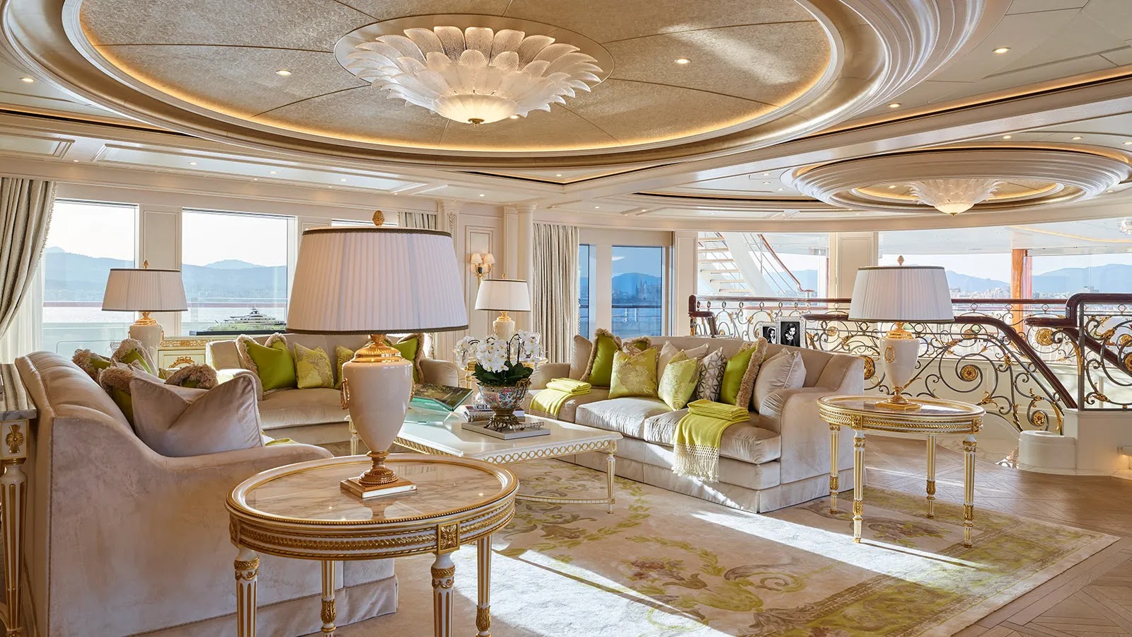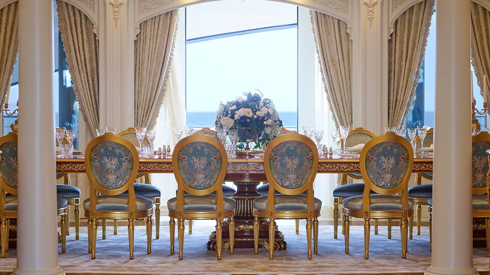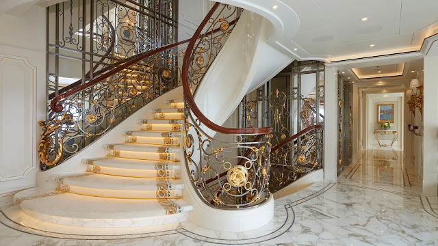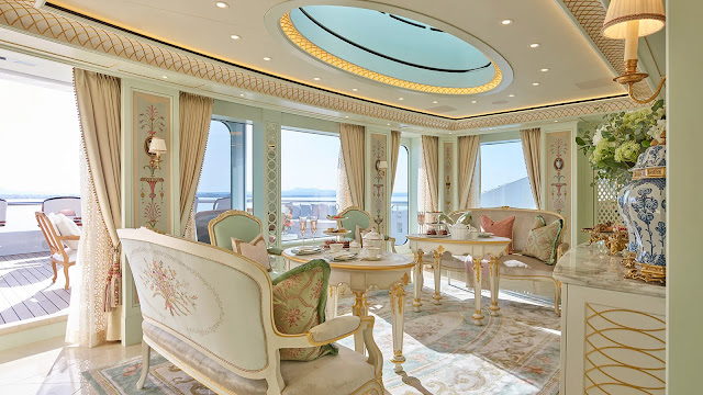 Some of the spaces rival Versailles for elegance, with Louis XIV to XVIII-inspired furniture on the main deck and carpet patterns mimicking those of the era from Parisian salons.