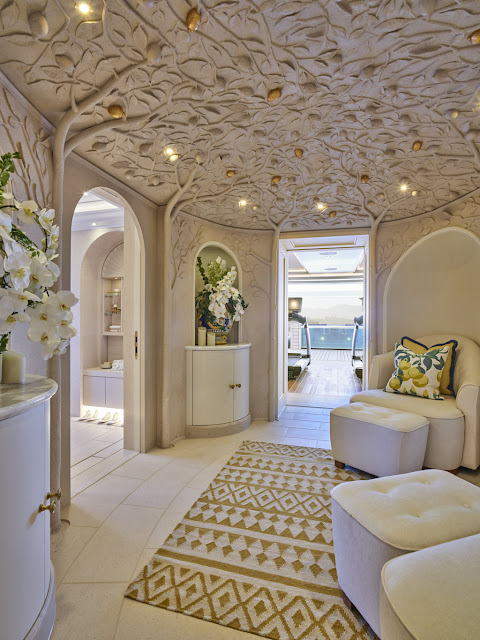 The relaxation area at the center of the spa on the bridge deck has a hand-painted bas-relief lemon grove on the domed ceiling. There is also a gym, hammam, beauty salon, and massage room on this deck.