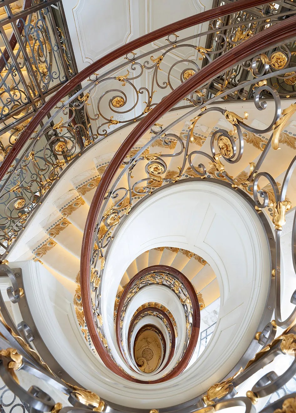 The central stairs, with handrails in gilded wrought iron, wind up through an atrium soaring 15 meters.