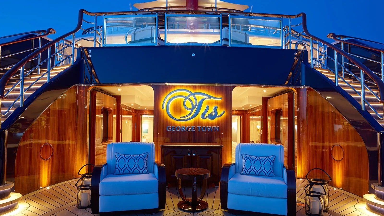 The 'mahogany' trim on her stern is faux-painted steel. Beyond is the comprehensive beach club, "which [the owners] wanted to create a sense of welcome for guests", says Andrew Winch, the yacht's designer.