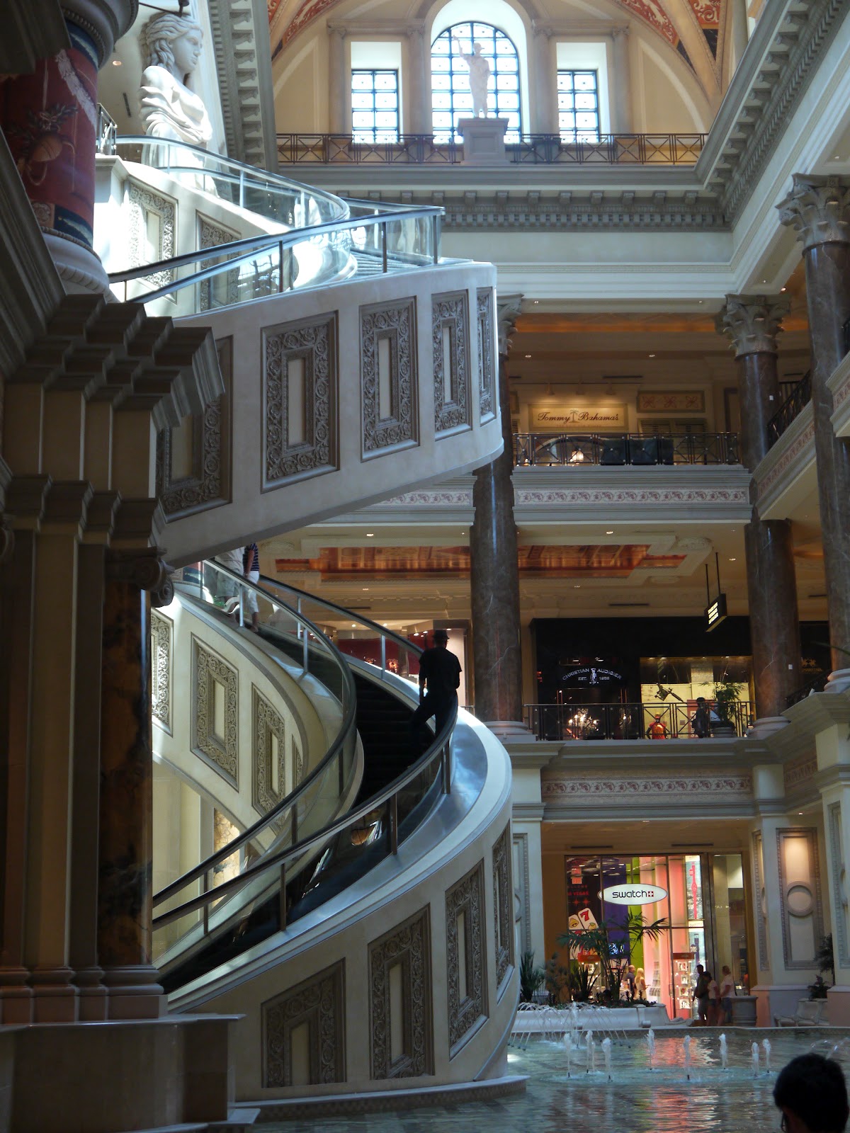 The circular escalator in Ceasars Forum. Loads of the shopping centres are themed. Ceasars Forum was all Roman themed, whilst The Venetian's shopping center was all Venetian themed.