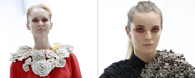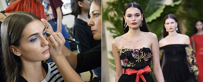 While Chanel had an indiscriminate palette that made use of a variety of colours, two other designers utilised the power of single hue to make a bold statement at their shows. The makeup looks on Xuan’s models was mainly characterised by the sunny orange shadow that was smudged in a halo around their eyes and went up to their brow bones. For a look where picking the right hue is essential, the sunshine shade was a good call. The models’ pale complexions were given a spark of radiance; any darker a shade would have made them look more grunge instead. Over at Galia Lahav, makeup artists made the case for eye-popping makeup with a daring electric blue winged eyeliner. Paired with an equally bold ruby red lipstick, models exuded more of a rockstar energy than the elegance demanded by their grand gowns. However, with makeup as flawlessly executed as theirs, that can easily be excused.