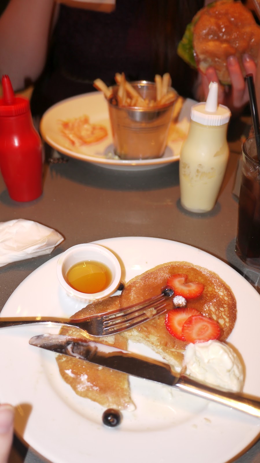 Katie had the VQ burger and fries, while I had my usual - buttermilk pancakes with a side of sweet potato fries and sour cream.