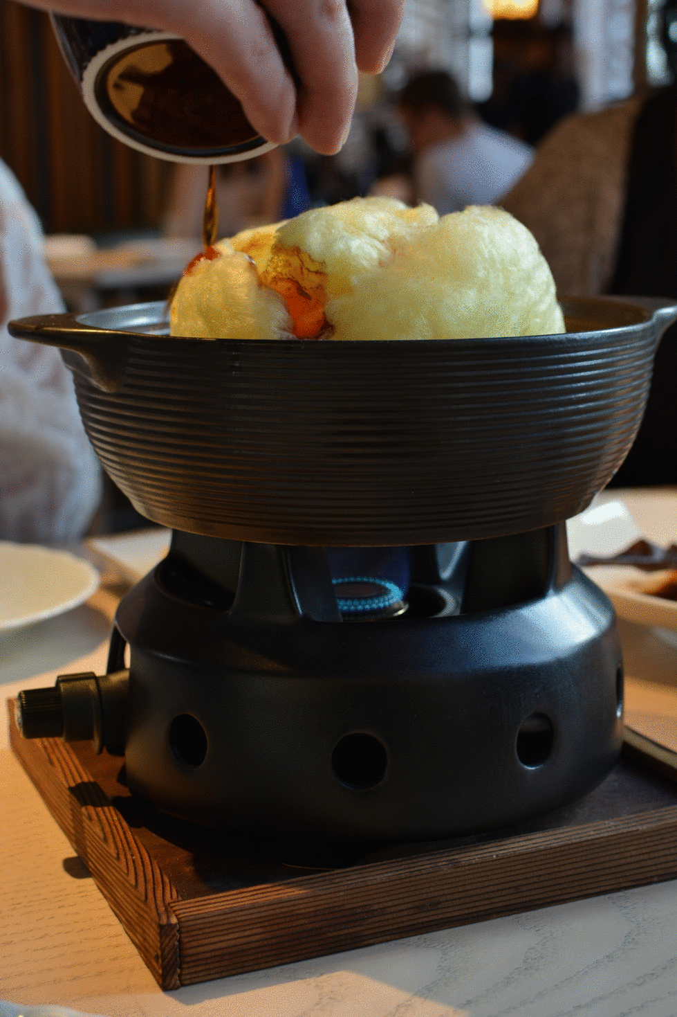 I was assured by the girls that the salmon was excellent, however the real showstopper was the Sukiyaki, a dish of sliced rib eye beef served with vegetables, tofu, and mushrooms. The dish is served on a hotplate at the table and topped with a huge ball of candy floss, the waiter then pours a hot sauce over the candy floss and it all dissolves into the dish.