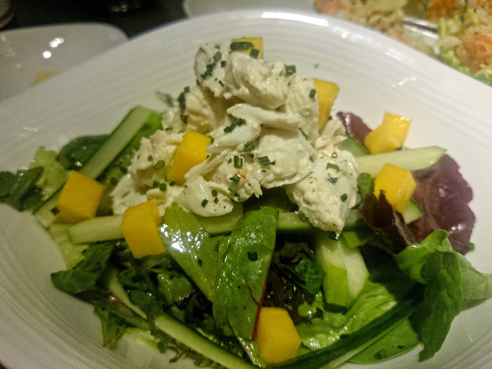 The restaurant is on the site of what used to be 'The Palm' on Pont Street, and what a difference compared to The Palm! After a full refurb gone is the dark old fashioned room, and instead it's light and sophisticated, classy, even. After a drink at the bar and a catch-up we were seated, and handed the seafood-heavy menu. I chose the crab salad to start, while Henry went for the salmon salad, and we ordered some California maki rolls (a type of sushi) to share. Please excuse the photos, I only had my phone on me :'(