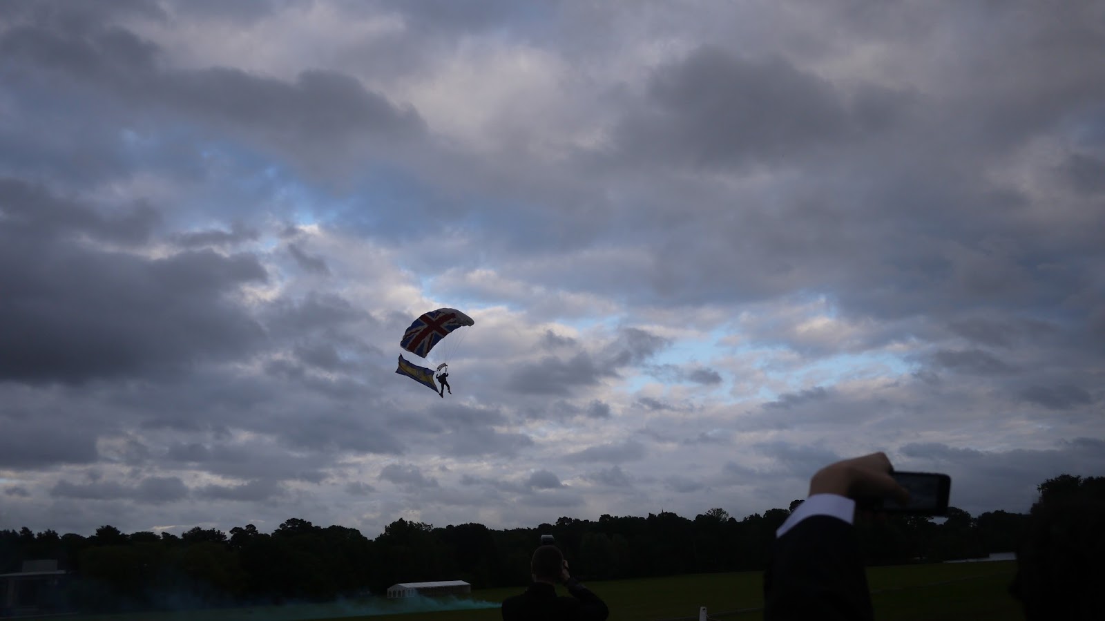 The ball was the same day as Royal Ascot, so I had to race from the racetrack to the academy, and then quickly change into black tie. I just about managed it, and after my quick change I headed down to meet everyone else outside new college. The men were in either uniform or black tie (depending on if they were a cadet/soldier or a 'civvie'), while the ladies were in glamorous evening dresses. The evening started with fish and chips in cute little paper cones, and ice-cream from an old fashioned cart, before we saw a parachute display, and then we all went inside for a delicious meal, the charity auction, and dancing!