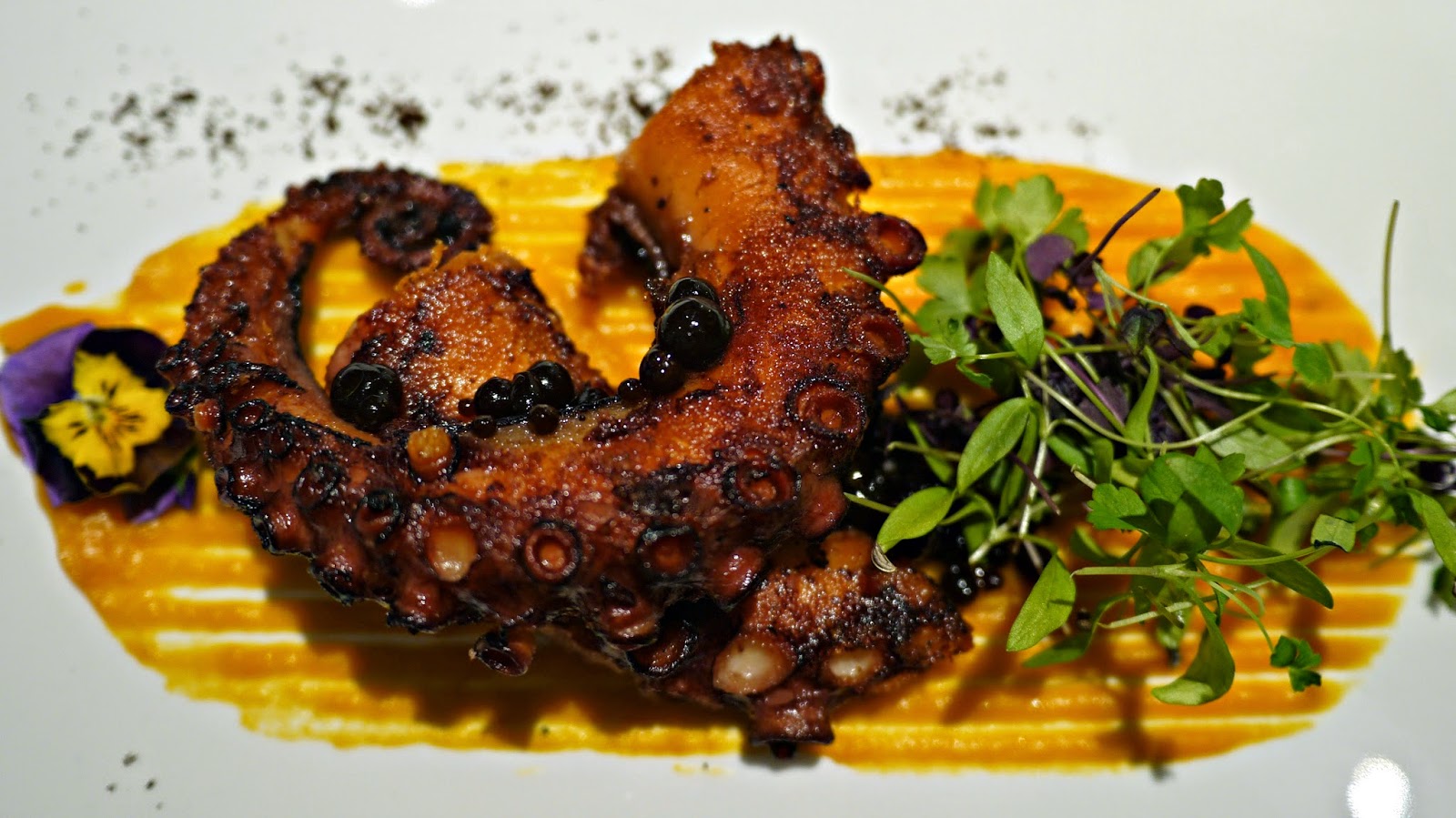 After the intriguing mousse, we then moved on to one of my favourite dishes of the night, the octopus cooked in olive oil with pumpkin cream, coffee pearls, and watercress sprouts. I adore octopus, and this one was probably the best I've ever tasted. It was cooked to perfection; crispy on the outside, not too tough inside, and so full of flavour. The wine that was paired with this was another good one, really light and fruity, and the ideal accompaniment for the octopus.