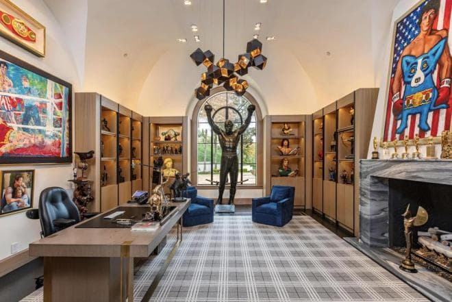 Moving into the home, it’s clear that the home is owned by none other than Sylvester Stallone as the numerous pieces of memorabilia will tell you. Throughout the mansion one will find Rambo and Rocky-inspired art and sculptures which pay tribute to Stallone’s best-selling movies. This is especially true of the actor’s home office which is a treasure trove of movie-memorabilia.