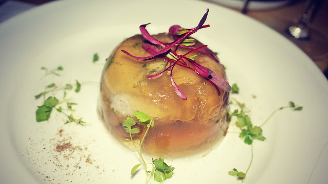 We started with Quail, which had prune in the middle, and the entire thing was encased in jelly. I was quite surprised by just how tasty this was; the Quail was slightly stronger in taste than normal poultry, but super yummy, and the sweetness of the prune just made the dish. You all know how I feel about mixing savoury and sweet (love). The only bad thing is that I then went home and Googled what a Quail actually looks like...and they're really cute little birds...so now I feel bad :( The Pinot Gris that accompanied the dish was very light and sweet, and complimented it perfectly.