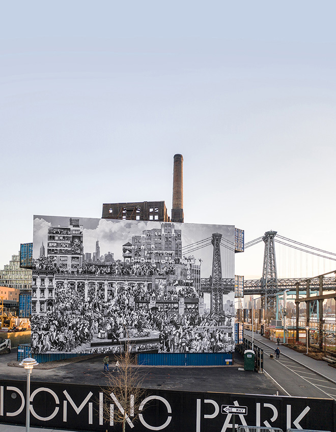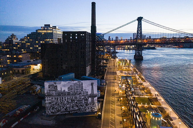 His latest work, dubbed ‘The Chronicles of New York’, showcases an astonishing 53-foot high mural, carefully installed onto an array of stacked shipping containers in Williamsburg’s Domino Park – with the help of local architectural and sustainable design studio, LOT-EK. Depicting over 1,000 New Yorkers, the mural which was initially developed as a centerpiece for a major exhibit on view at the Brooklyn Museum , entitled ‘JR Chronicles’ – was significantly enlarged to create JR’s largest installation, to date.