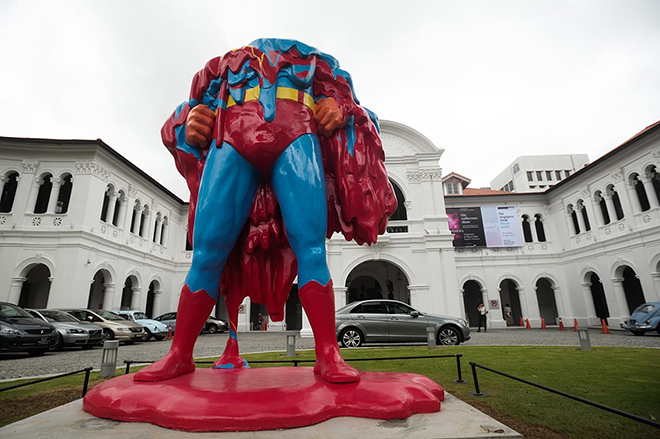 You may have seen the larger-than-life Melting Superhero in front of the Singapore Art Museum (SAM) during the 2012 Future Proof exhibition. A collaboration between Mojoko and fellow artist Eric Foenander, the massive figure in blue tights and a red codpiece was hard to miss and even more striking for its lack of torso and head. At first glance it was comical – this gaudy, brawny mess dripping and dissolving like a giant candle. But it didn’t take long before the message was clear – No One Can Save Us. The title of the artwork sums up how even our superheroes can’t prevent us from continuing to heat up the planet and destroy our own existence.