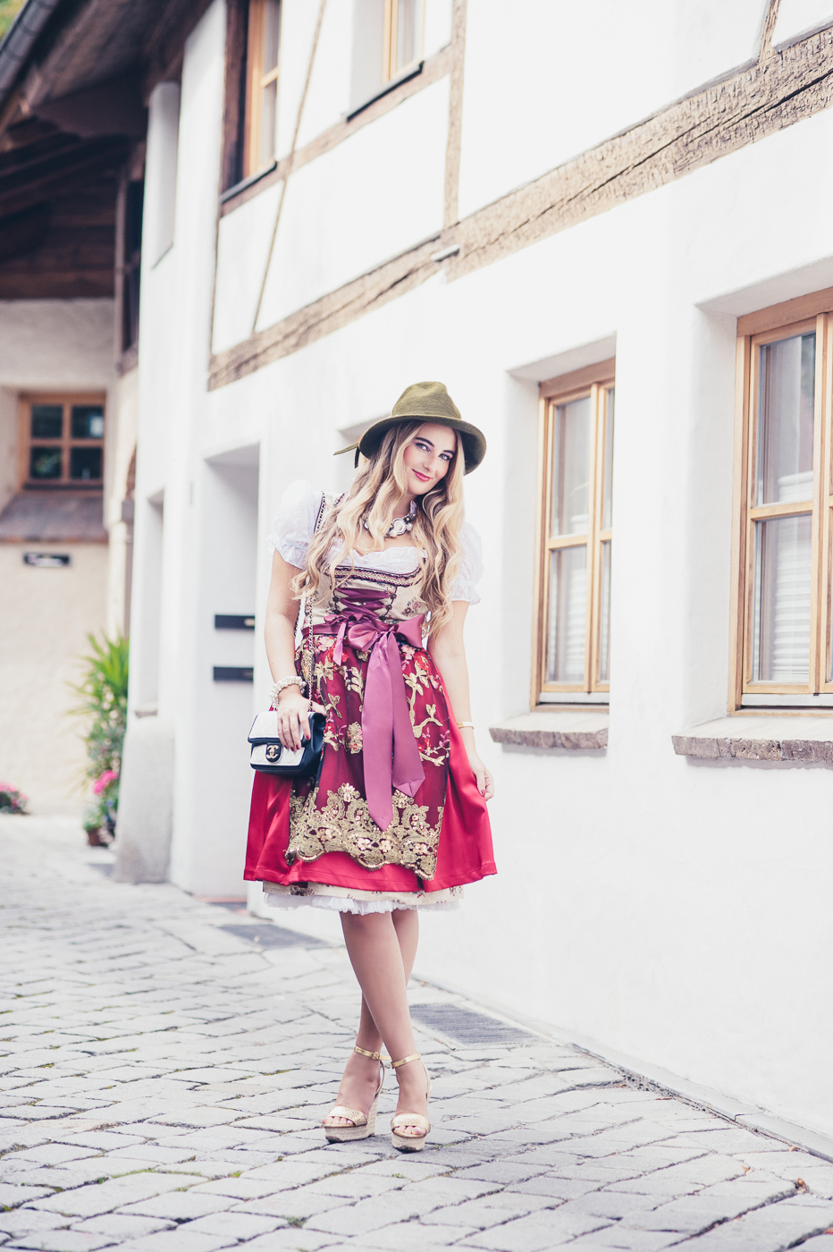 The Blond Macaron: This picture of me and my grandma was taken when I was 3 years old in the Bavarian village Rosenheim. My granny loves to tailor twin looks for me and her. We often wore the same dress just in the little and bigger version. My grandma always goes for flowery prints as I do oftentimes. That is why I chose a dirndl with flower prints in natural colors for this shooting. The vintage olive hat by my granny is really one of my favorites because he gives the glamours red Dirndl an old-school touch. I love it!