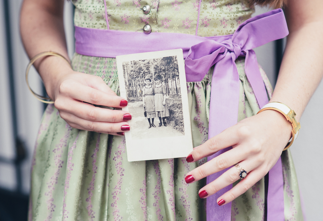 The Brun Macaron: The picture of my great-grandma was taken 1920 in Falkenstein, a charming village in Bavaria where she used to live. She and her best friend are wearing a twinsie dirndl look – just as them we are loving to match our outfits too. My great-grandma wears a look I would totally wear nowadays, too. The latest trend this Oktoberfest season are traditional cotton dirndl with a button front instead of a lacing, just as the dirndl I am wearing today. The outfit of my great-grandma inspired me to play with some accessories. I love the combination of the dirndl with old pearls by my great-granny and kitten block heels. Get the dirndl here!