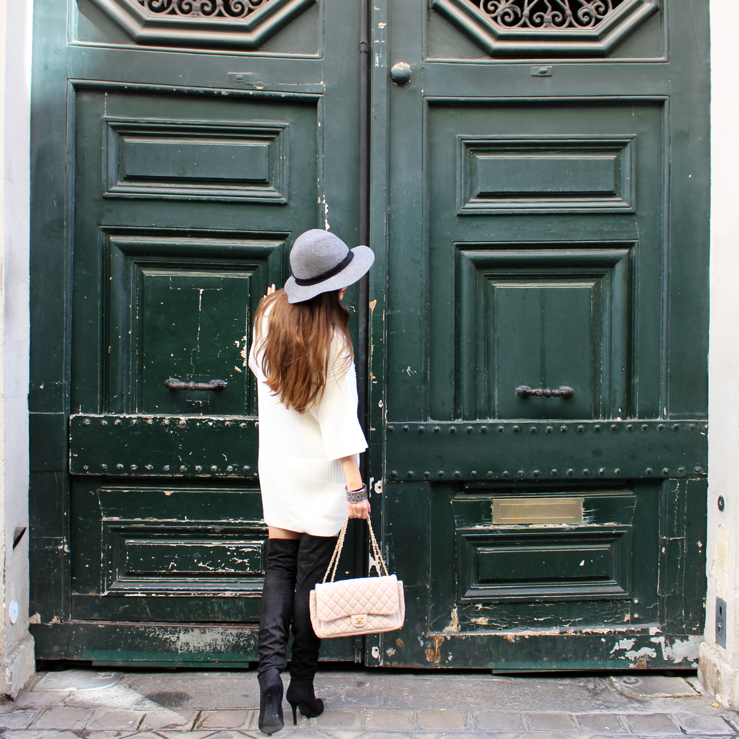 But this post is not about doors, right ; ) but rather about cozy sweater dresses and CC bags (when in Paris you have to wear Chanel). Oversized knit dresses to start the fall season right plus high-high boots to add some sexiness to the coziness. The Brun Macaron sticks to chanelicious black and white, while The Blond Macaron combines different shades of autumn. To bring a little brit chic to Paris (as London is our 2nd favorite city on earth) we put on some arm stack by Halcyon Days. Their timeless high end designs are perfect for every day and every outfit.