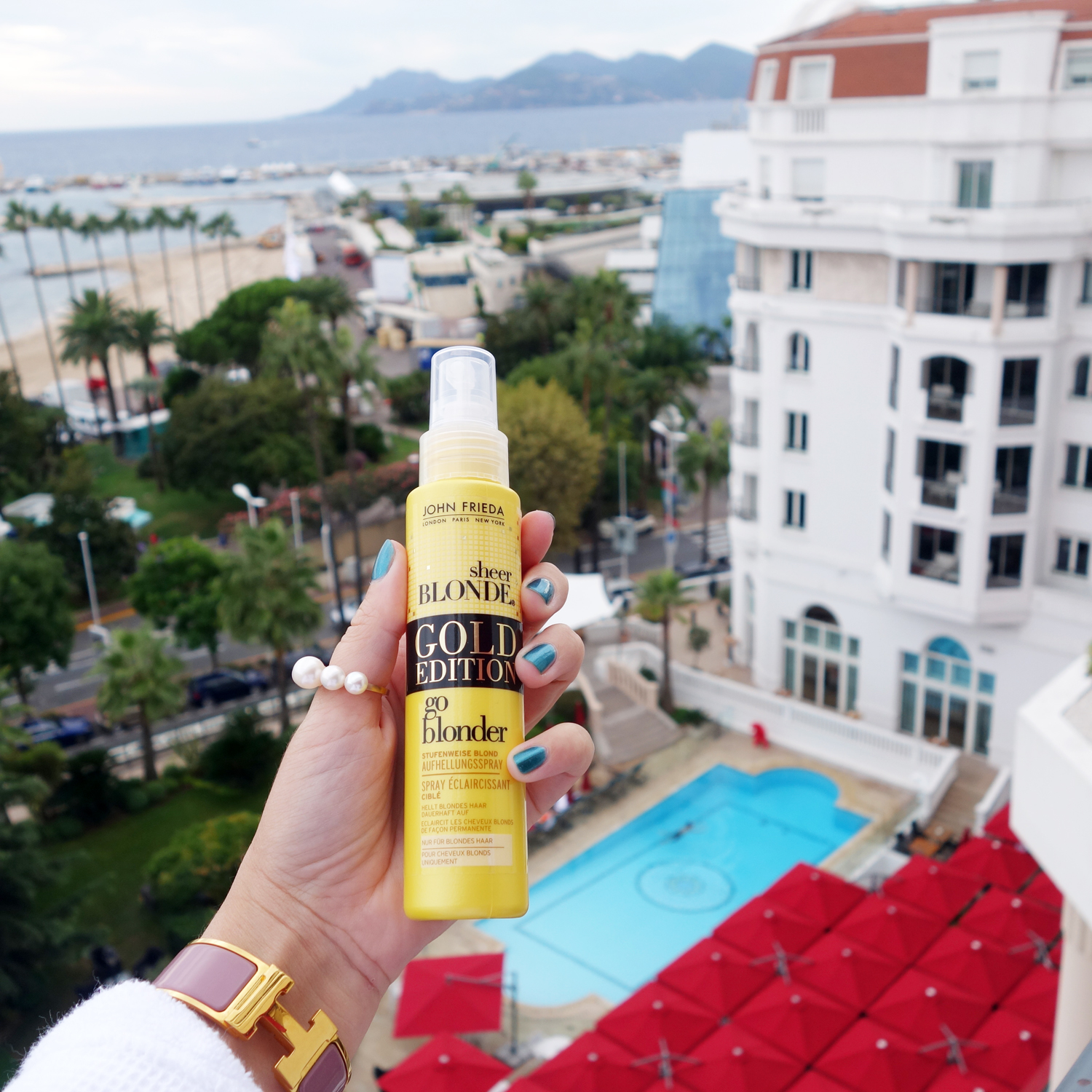 We love our beach highlights after holidays and of course want to keep them till the winter comes. An amazing way to simply lighten up your hair at home are the John Frieda Go Blonder products. The Blond Macaron loves to use it once a week to shine with a golden lion’s mane. Just apply the spray after washing.