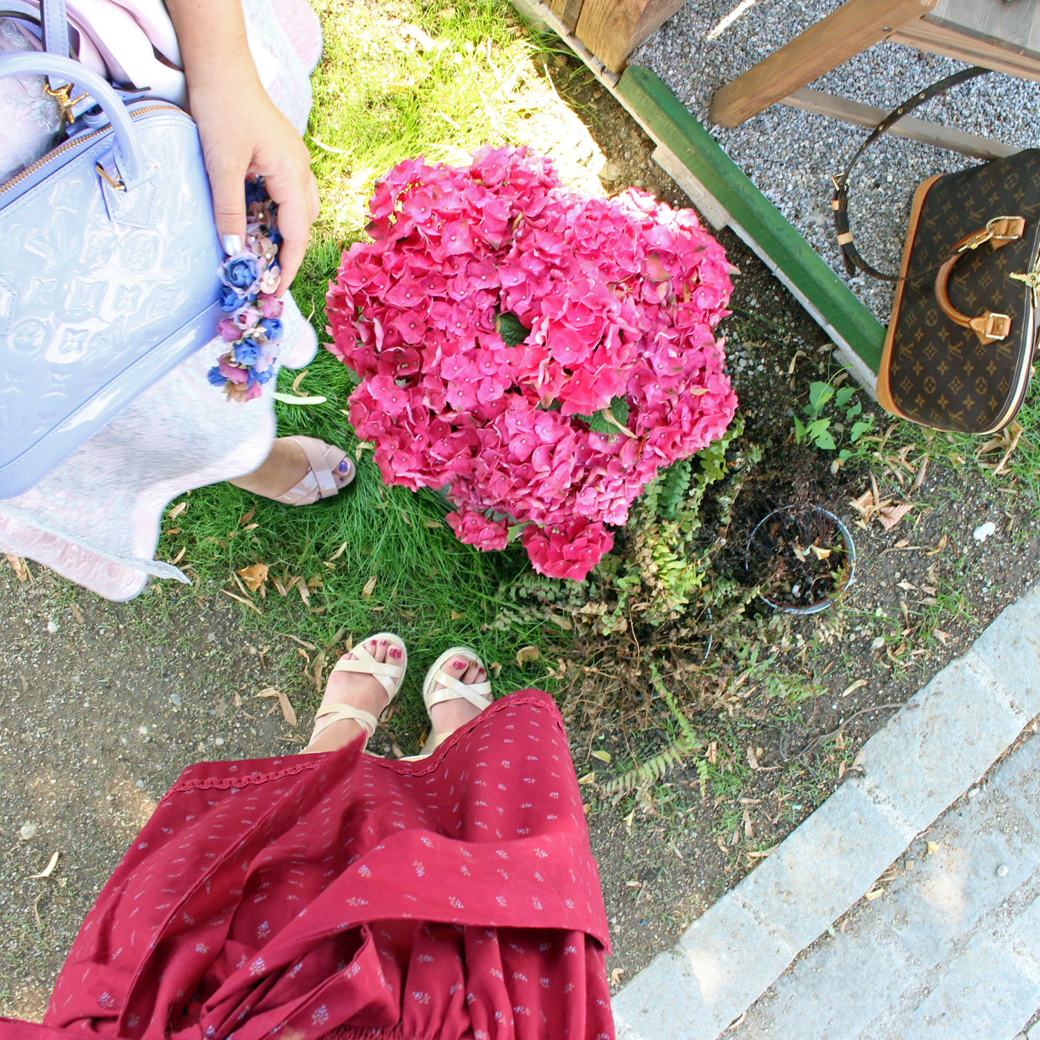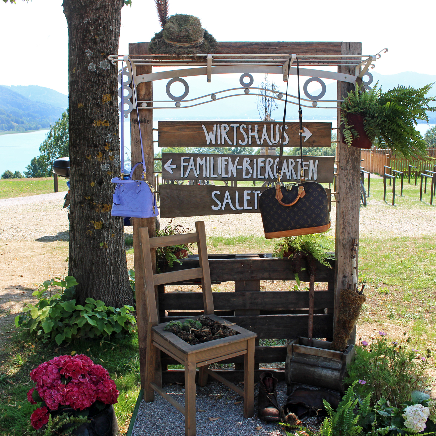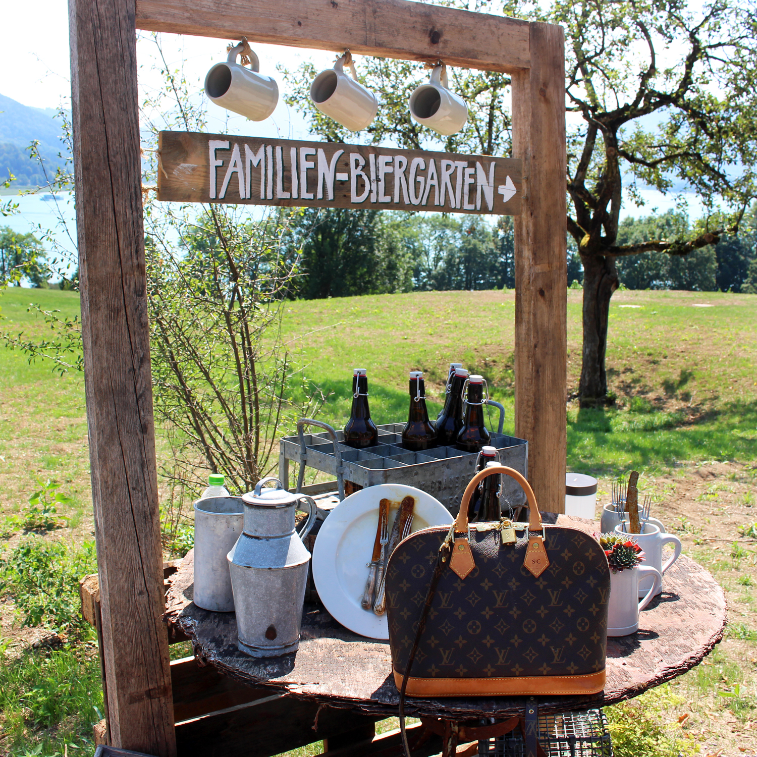 Classy cotton dirndl for the most classy and traditional Wiesn apperance! The Brun Macaron’s choice for rocking the Schützen tent. King Mathe adds some luxe to the plain cotton dirndl with beautiful details and decorations. Natural browns and reds are matching perfectly with the country side. The iconic Louis Vuitton Alma harmonizes with the traditional chic and Jimmy Choo wedges complete the simple but very classy Waldfest and Oktoberfest look.