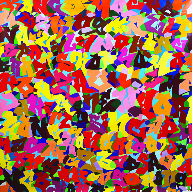 My latest painting is based on a poem by Charles Baudelaire that I reinterpreted called Hymne à la Beauté (Hymn to Beauty), which is part of Les Fleurs du Mal (The Flowers of Evil). It’s a painting that takes me a lot time, in which I put in a lot of energy, but I always work on several paintings at the same time, otherwise I get bored very quickly. Sometimes, when I’ve advanced well on a painting, I let it sleep for a while. With Hymne à la Beauté, I had started to sketch it last November, and I’ve been at it for eight months already. I come back to it regularly, at least a good week or 15 days every month, but there was a moment when I couldn’t take it anymore because it’s really big. It’s 4 metres wide and 4.5 metres high and full of tiny letters, so it requires a lot of work and a lot of time.